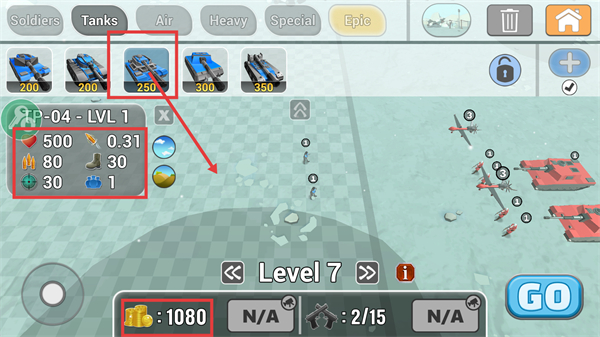 1、处于【Level-7】时,选用花费250的【TP-04-LVL-1】坦克部署,确认1080-金币储备后,点击【GO】准备开启本关战斗。