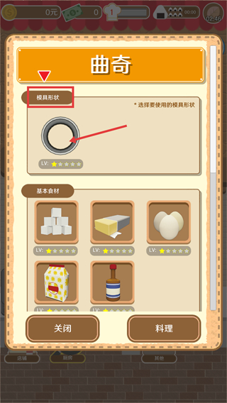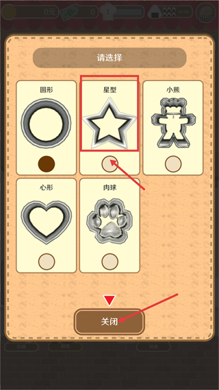 3、在模具选择界面选定【星型】模具,确认选择后点击【关闭】按钮返回上一级界面,继续推进曲奇的制作流程。