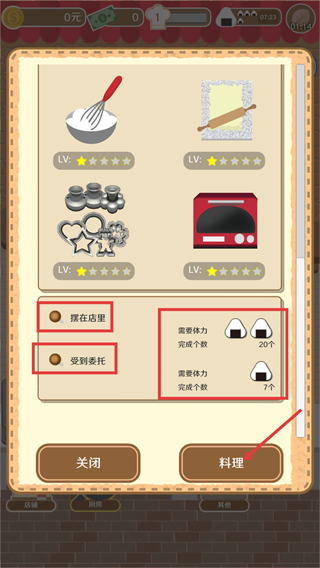 4、完成前期准备后,可选择【摆在店里】或【受到委托】,注意不同选项对应体力与完成个数,点击【料理】执行制作。
