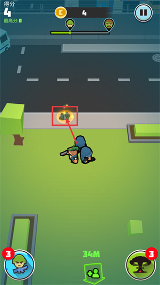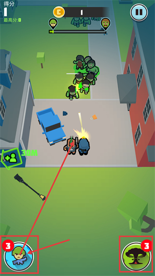 2、遭遇敌方单位时,使用底部技能(如士兵技能、炸弹技能)发动攻击,清除敌方障碍以推进战局,同时留意界面显示的距离提示。