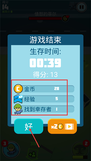 4、战斗结束后,查看生存时间、得分及奖励(28金币、5经验、1名幸存者),点击【好】按钮关闭结算界面,准备后续挑战。