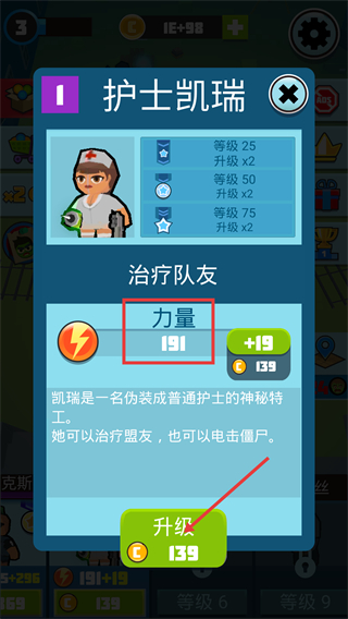 1、获取【护士凯瑞】后,可消耗139-金币提升其【力量】至191,她能治疗队友也能电击僵尸,后续等级25-50-75可各升级-x2强化能力。