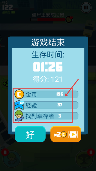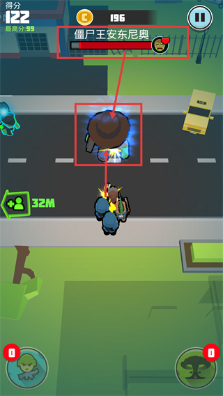 3、遭遇【僵尸王安东尼奥】时,集中火力攻击对应区域,关注其血量进度条,推进至32-M的同时积累196-金币提升得分至122。
