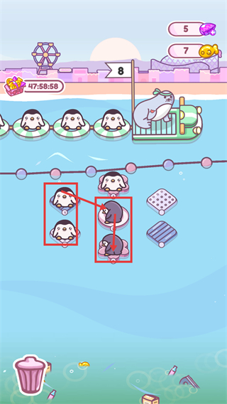 1、拖放对应样式的企鹅到指定位置完成匹配,推进关卡进程,同时留意上方【8】号标识对应的关卡进度要求。