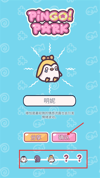 2、进入【PINGO-PARK】后,了解角色【明妮】的情绪设定,点击【确认】按钮可继续推进剧情流程。