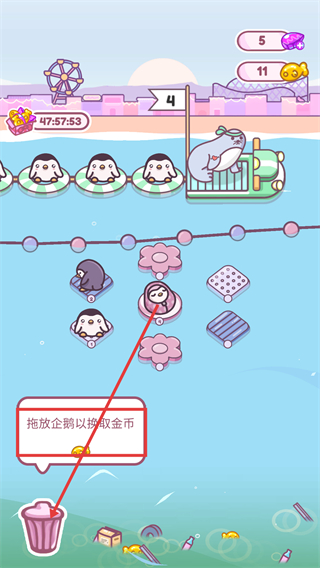 3、按照提示【拖放企鹅以换取金币】进行操作积累资源,同时关注上方【4】号标识对应的当前关卡进度。