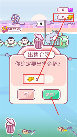4、当弹出【出售企鹅】的确认框时,确认可获得【3】个金币后,点击【是的!】按钮完成出售以积累资源。