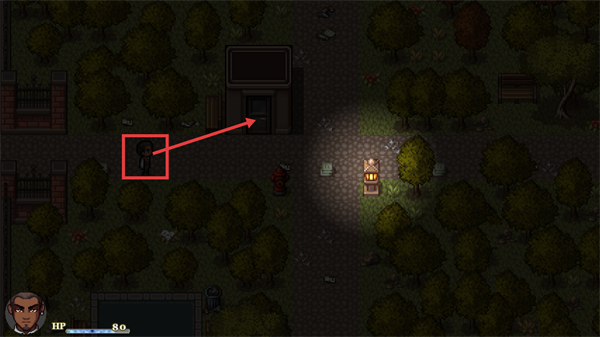 1、角色向标记的小屋门移动,探索该区域时留意周边可交互物品,同时关注【HP-80】的状态,避免陷入危险。