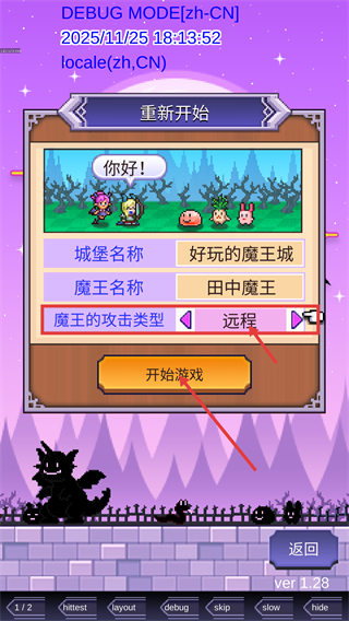 1、在界面选择【魔王的攻击类型-远程】后,确认【城堡名称-好玩的魔王城】等信息,点击【开始游戏】进入关卡。