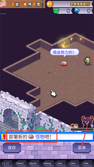 2、高自由度沙盒模式提供充分创作空间,无固定发展路径,可自由扩建、搭配魔物、布置陷阱,实现专属玩法风格。