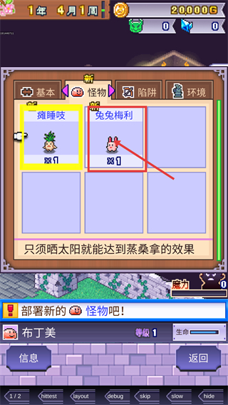 3、在【怪物】分类界面中,选择可用的【瘫睡吱】或【兔兔梅利】,选定后即可准备将其部署到城堡区域。