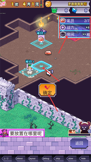 4、选定怪物放置位置后,点击【确定】完成部署,同时留意【定员-2/7】【房间-44格】等数值限制来规划配置。