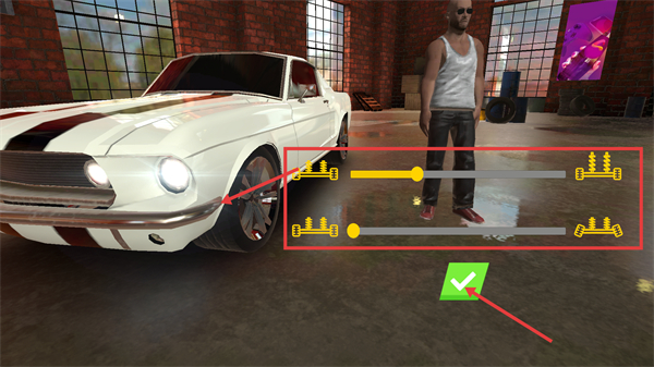 2、在车辆配置界面,通过滑块调节悬挂对应的参数(匹配弹簧标识),调整完成后点击绿色对勾,确认车辆性能的相关设置。
