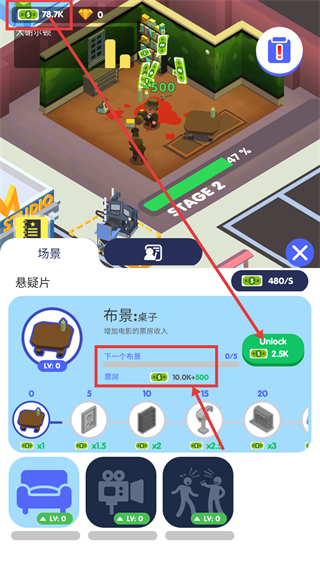 4、在【悬疑片】场景界面,点击【UnLock】解锁下一个布景,能提升票房至【10.0K+500】,增加影片收入。