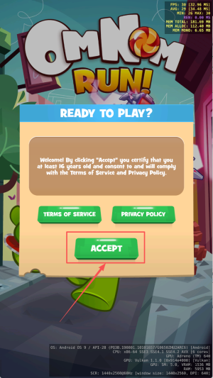 1、接受条款:在游戏启动界面,阅读并同意服务条款和隐私政策,然后点击“ACCEPT”按钮进入游戏。