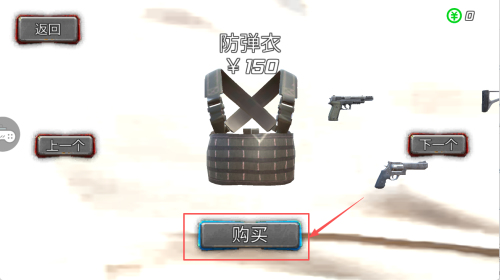 2、购买装备:在武器选择界面中,点击“购买”按钮,获取防弹衣等装备。