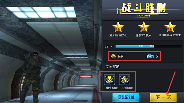 4、达成【战斗胜利】获三星,升级至【LV4】得100金币与勋章,点击【下一天】进入下一关继续挑战。