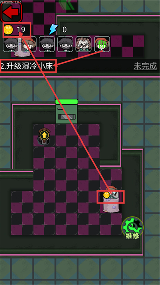 2、对局内积累金币至19,推进【升级湿冷小床】任务,通过获取【+1-金币】储备升级资源,同时可使用维修功能。