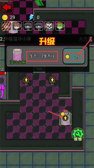 3、当金币达29时,消耗【25-金币】升级【湿冷小床】,使其生产效率提升至【2-金币/s】,加快资源获取速度。