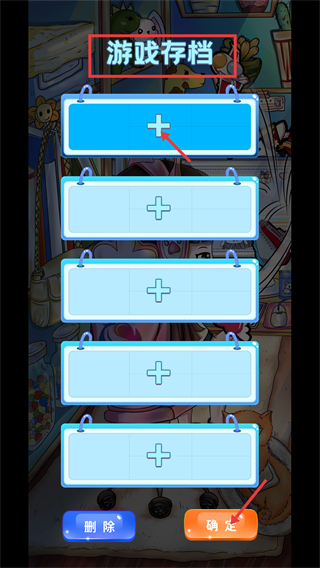 1、进入【游戏存档】界面后,点击带【+】的栏位创建新存档,选定后点击【确定】完成操作,注意避免误触【删除】按钮。