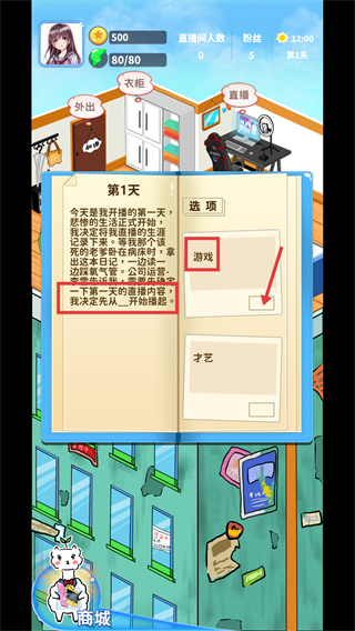 2、【第1天】开启直播流程时,选择【游戏】选项确定首播内容,同时可留意【衣柜】【外出】等功能的后续使用场景。