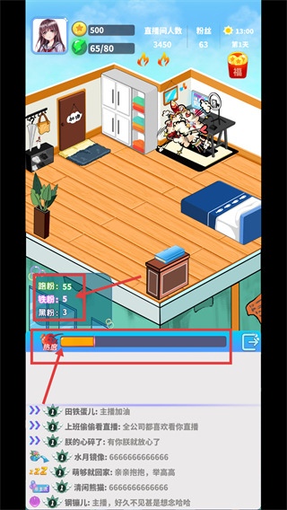 4、直播中关注【路粉-55】【铁粉-5】【黑粉-3】的数值变化,同时观察【热度】条状态来优化直播策略提升效果。