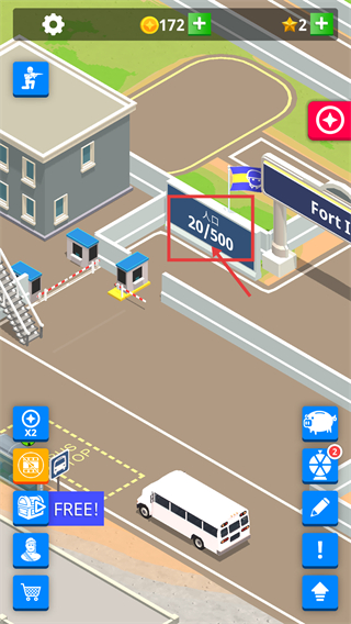 1、关注【人口-20/500】的当前数值,巴士抵达【公交站】后可继续接引新兵,同时留意【金币-172】的资源储备以支撑后续操作。