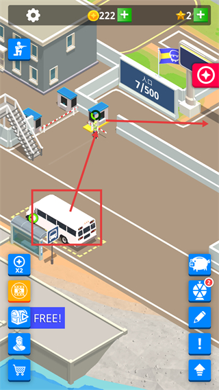 2、巴士停靠【公交站】后,点击闸口的交互标识完成新兵接引,此时【人口-7/500】【金币-222】同步更新,需持续关注设施状态。