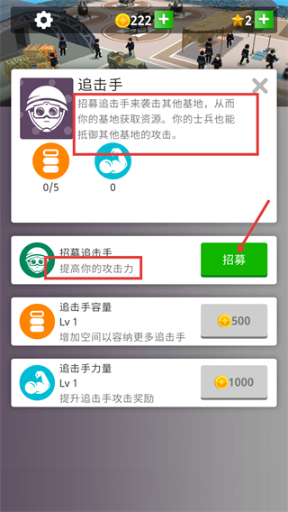 4、【追击手】可袭击其他基地获资源并防御攻击,点击【招募】按钮能【提高你的攻击力】,后续可升级其容量与力量。