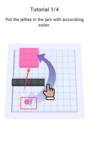 2、进入教程:在Tutorial1/4界面查看“把果冻放进对应颜色罐子”。