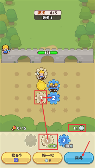 2、在【波次-4/5】【关卡1】中,消耗【10-钻石】兑换【1-级单位】后钻石剩【11-】,点击【战斗】推进,单位产出效率调整。