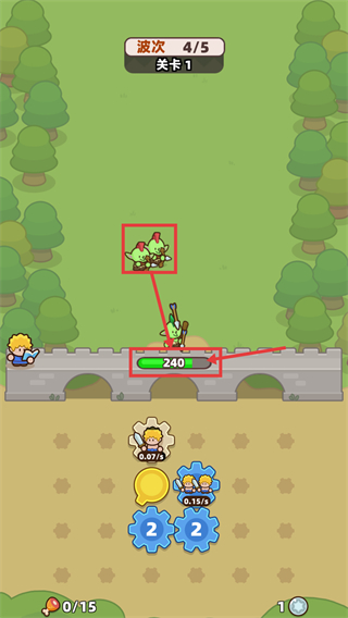 3、【波次-4/5】【关卡1】的战斗里,敌方怪物攻击使城墙血量降至【240-】,我方单位持续产出,需留意城墙血量状态。