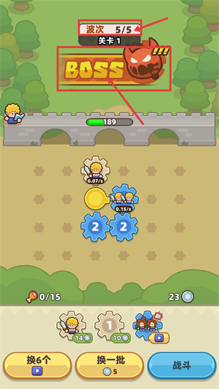 4、进入【波次-5/5】【关卡1】,触发【BOSS】战,当前城墙血量为【189-】,需集中单位战力应对最终波次的BOSS。