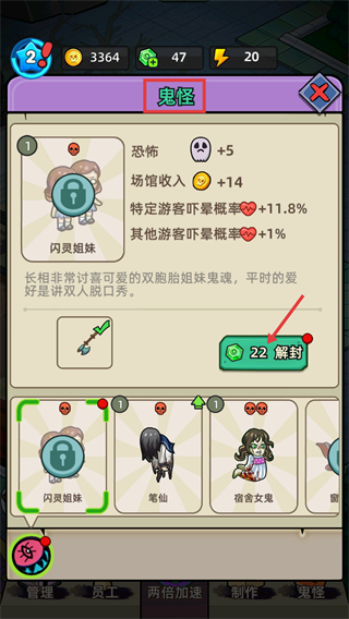 1、在【鬼怪】界面消耗【22-绿色资源】解封【闪灵姐妹】,其可提升【恐怖-+5】【场馆收入-+14】及游客吓晕概率,助力场馆运营。