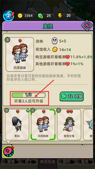 2、【闪灵姐妹】解封后,达成【吓晕2人】的升级条件,消耗【22-绿色资源】升级,提升其各项增益属性。