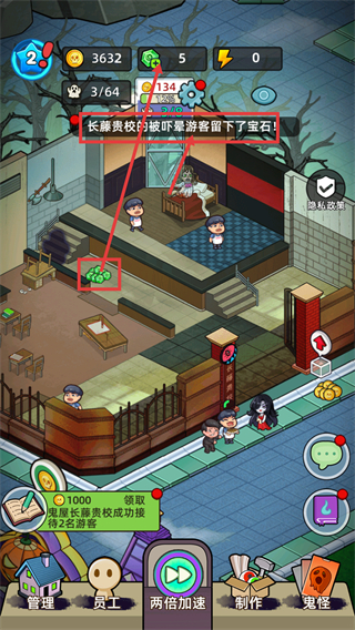 3、长藤贵校中被吓晕的游客会留下宝石,收集场景内的【绿色资源】,同时领取接待游客的金币奖励,积累资源。