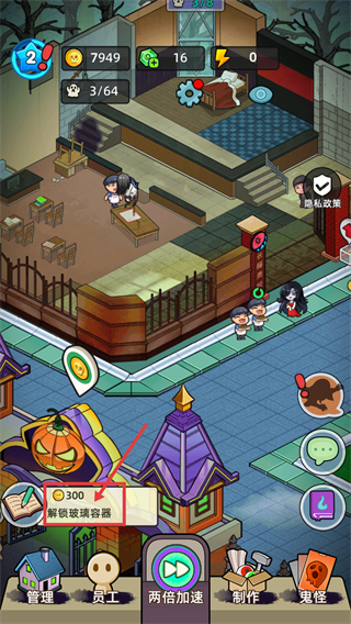 2、在长藤贵校的设施界面,消耗【1400-金币】解锁【玻璃容器】,解锁后可提升【刺激+1】【收入+2】,增强场馆的游客体验与收益能力。