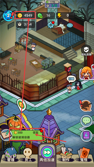 3、玻璃容器解锁后,消耗【2000-金币】将其升级至【LV.1】,升级后【刺激-1+2】【收入-2+2】,进一步强化该设施的增益效果。