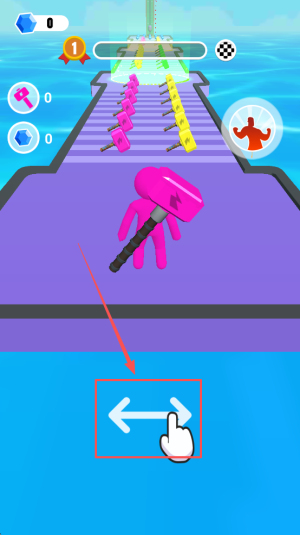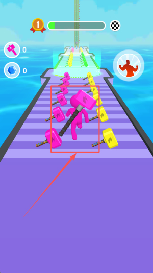 3、巨锤突破闯关:借助变大的锤子击碎途中障碍,扫清前进阻碍,稳步向终点推进并锁定最终敌人。