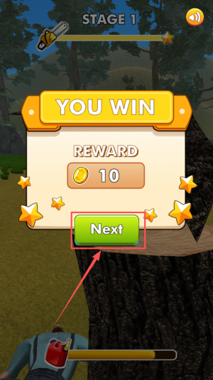 3、完成挑战:砍树后屏幕显示“STAGE 1 YOU WIN”与“REWARD 10”,表示通关并获得奖励。
