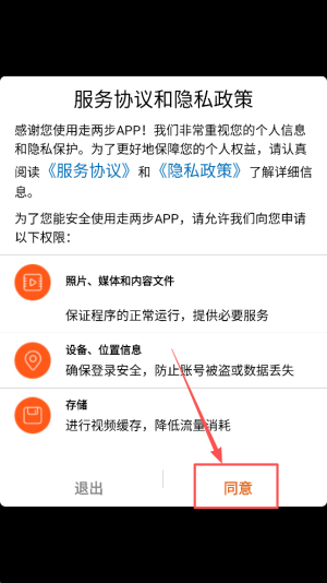 1、阅读协议:首先打开服务协议界面,浏览权限说明后点击“同意”按钮。