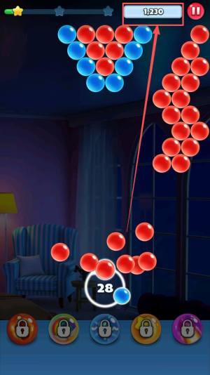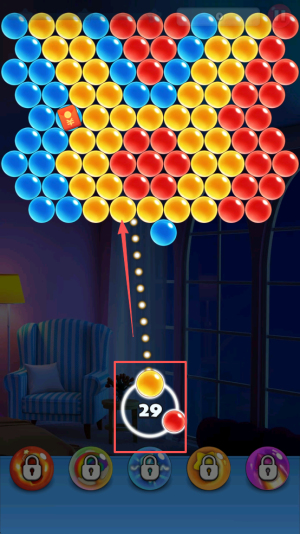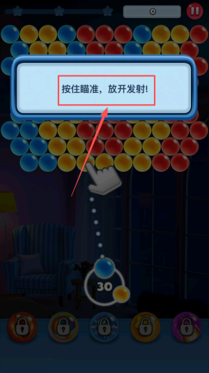 2、精准瞄准发射:瞄准空中彩色泡泡,调整角度将同色泡泡聚集后发射,实现高效消除。