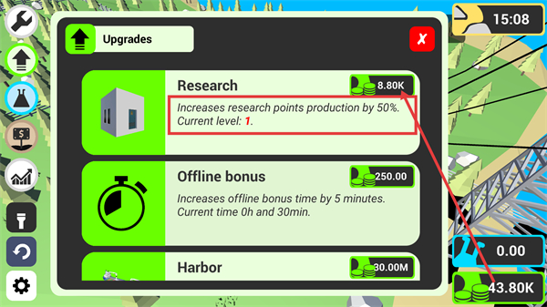 1、进入【Upgrades】界面,优先选择【Research】升级项,消耗8.80K-资源,可提升研究点产量50%,当前等级为1,助力科技解锁。