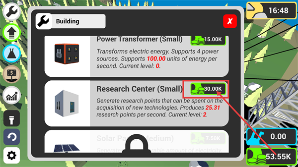 2、在【Building】界面,解锁【Research-Center-(Small)】需消耗30.00K-资源,其每秒产25.31-研究点,当前等级为2,强化研究效率。
