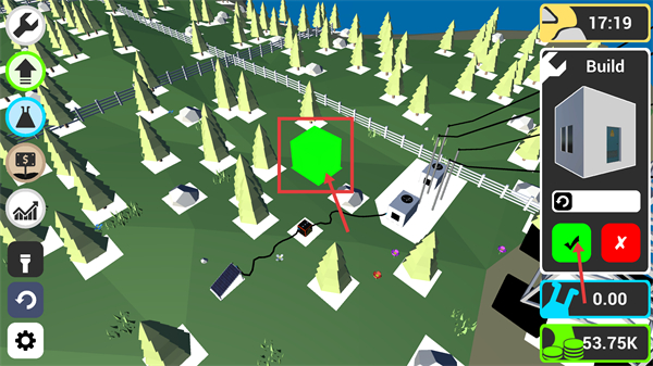 3、进入建造界面,选定建筑后定位绿色区域,点击右侧绿色对勾按钮完成建造,当前53.75K-资源可支撑该操作。