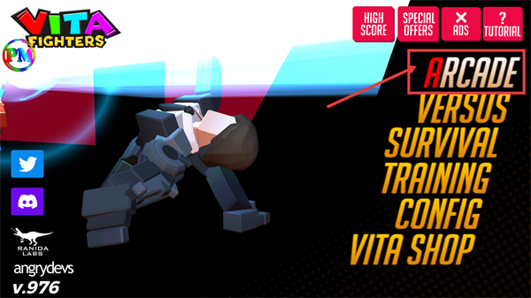 1、进入【VITA-FIGHTERS】主界面,可选择【ARCADE】模式开启对战,还有【VERSUS】【SURVIVAL】等模式供不同玩法选择。