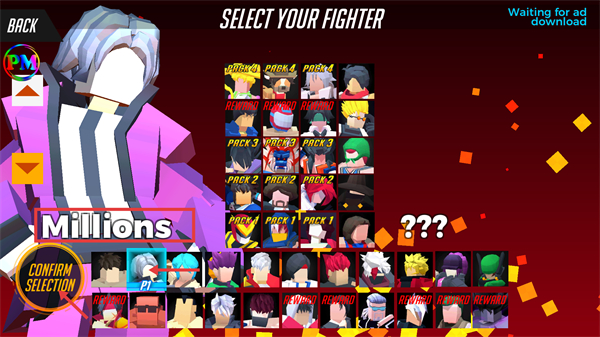 2、在【SELECT-YOUR-FIGHTER】界面选定【Millions】角色后,点击【CONFIRM-SELECTION】确认,【PACK-4】等池还有更多角色可选。