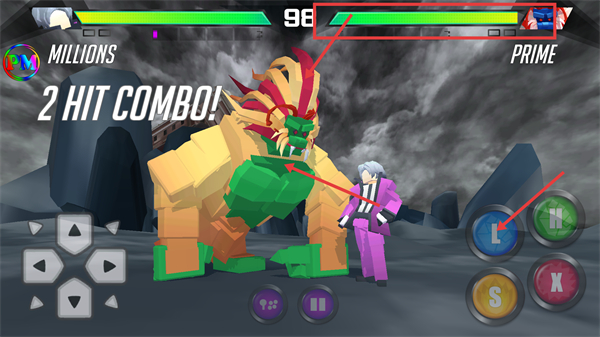 3、操控【Millions】对战【Prime】时,用【L】键等技能衔接触发【2-HIT-COMBO!】,关注血量【98】及时调整攻防节奏。
