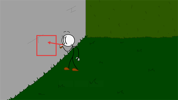 2、操控火柴人使用锄头,交互红色框标注的墙壁区域,通过挖掘该区域打开新通道,进入后续场景。