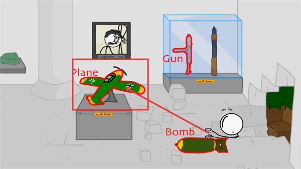 3、进入展厅场景后,关注红色框标注的【Plane飞机模型】,结合场景内的【Bomb炸弹】等物品,后续可借助这些道具完成场景交互目标。